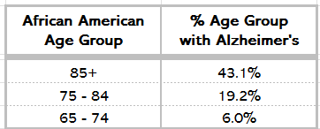 Approximately 48 million people (14.4%) in the US are African American. According to Us Against Alzheimer’s, there are 5.1 million African Americans over the age of 65 and 1.1 million people in the African American senior population who have some cognitive impairment associated with Alzheimer’s or other causes of dementia.